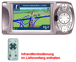 - Wahlweise eingeblendet: Nordrichtung (Kompaß), Distanz zum nächsten Abbiegen, Restdistanz, Ankunftszeit, Geschwindigkeit